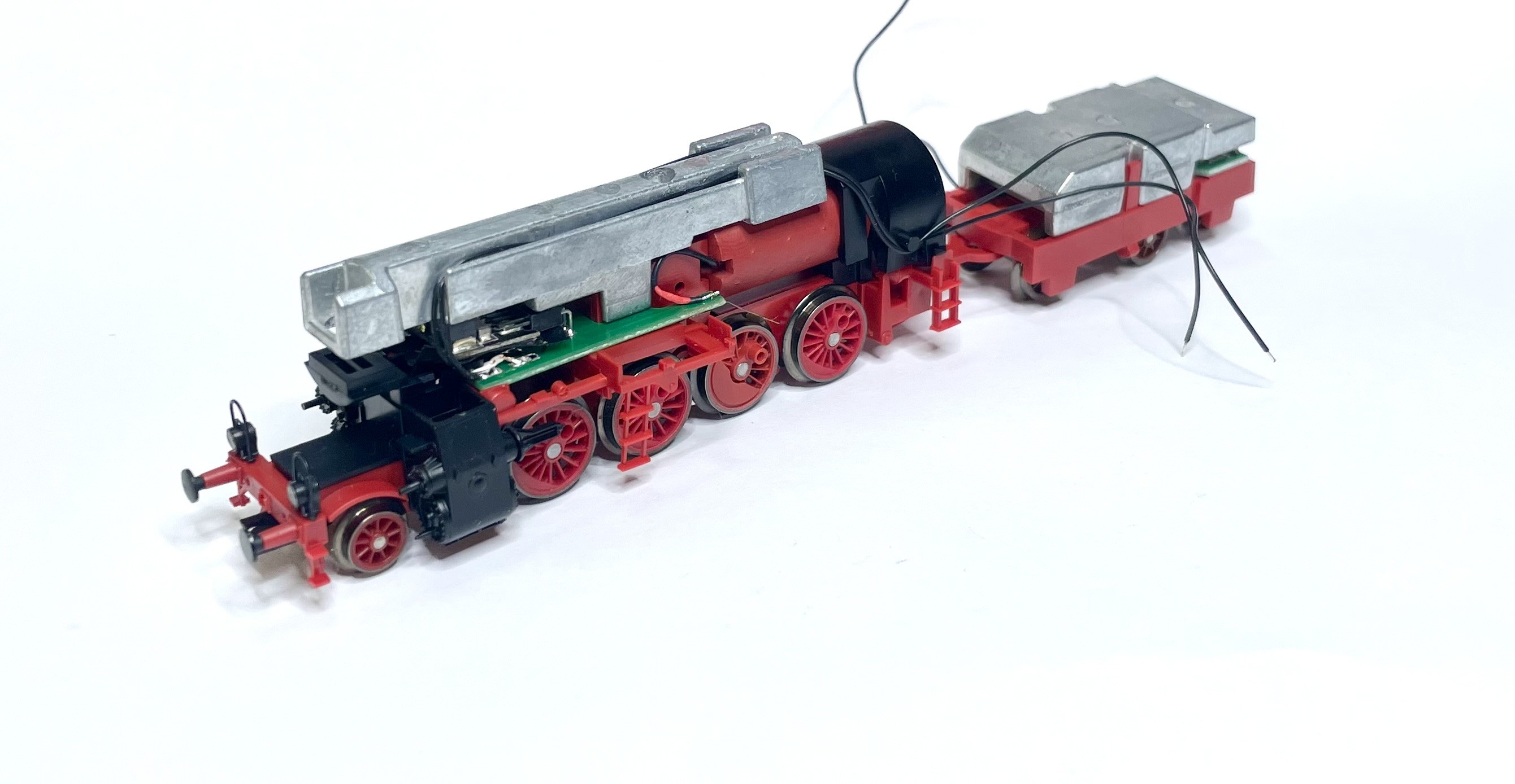 Die Kabelverbindung (4 Drähte)zwischen Fahrwerk und Tender ist wegen des sicheren Transports noch nicht gelötet,