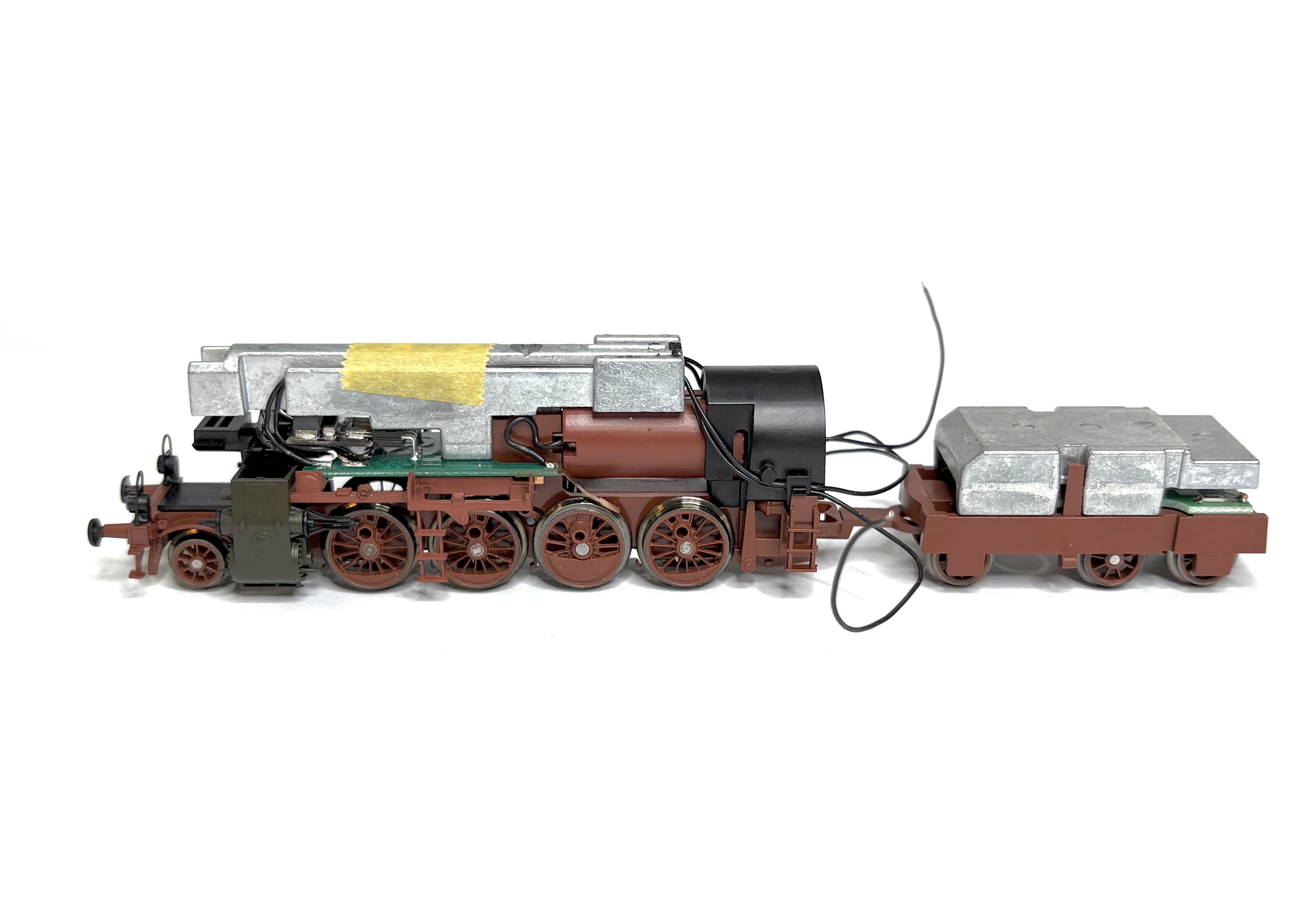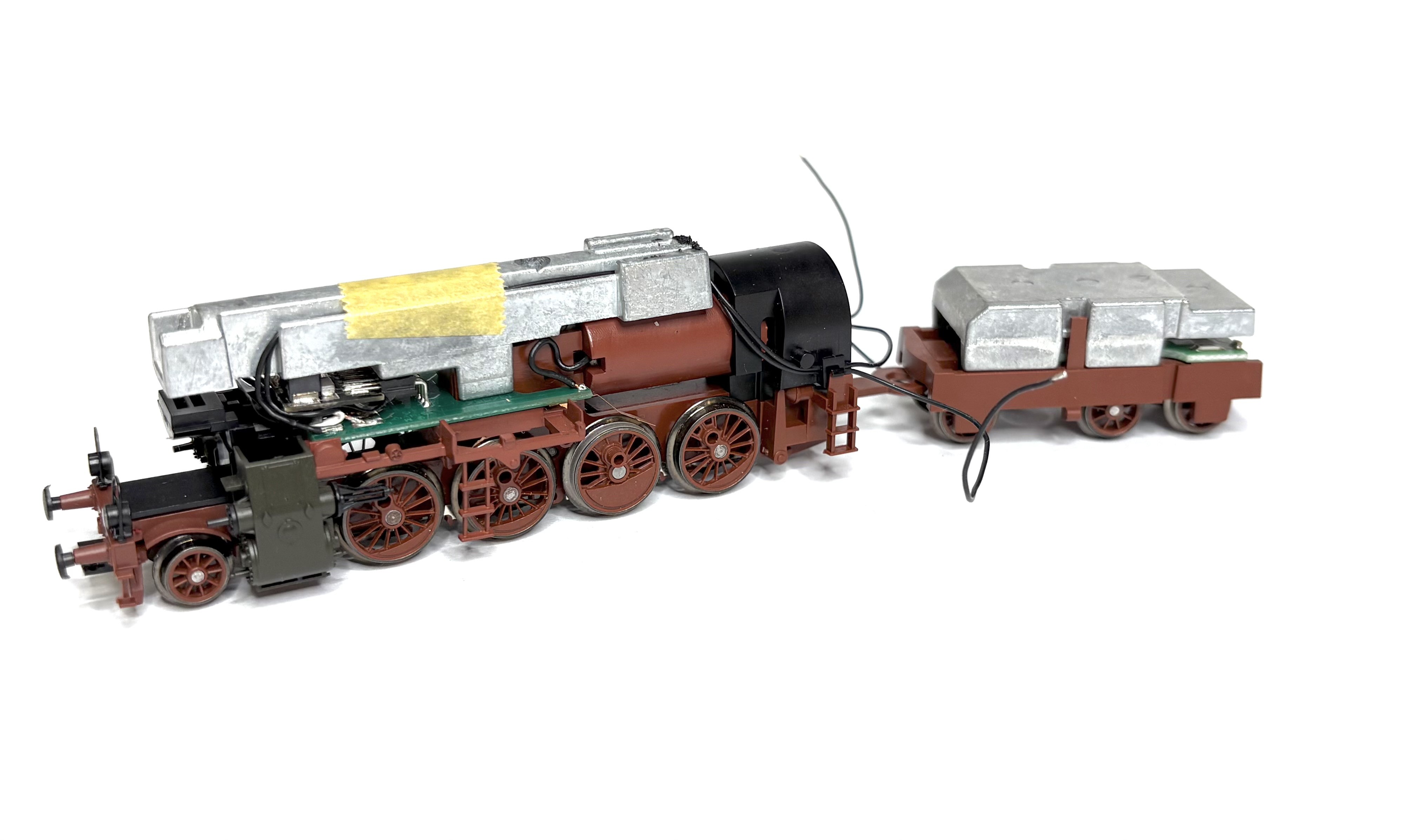 Die Kabelverbindung (4 Drähte)zwischen Fahrwerk und Tender ist wegen des sicheren Transports noch nicht gelötet,