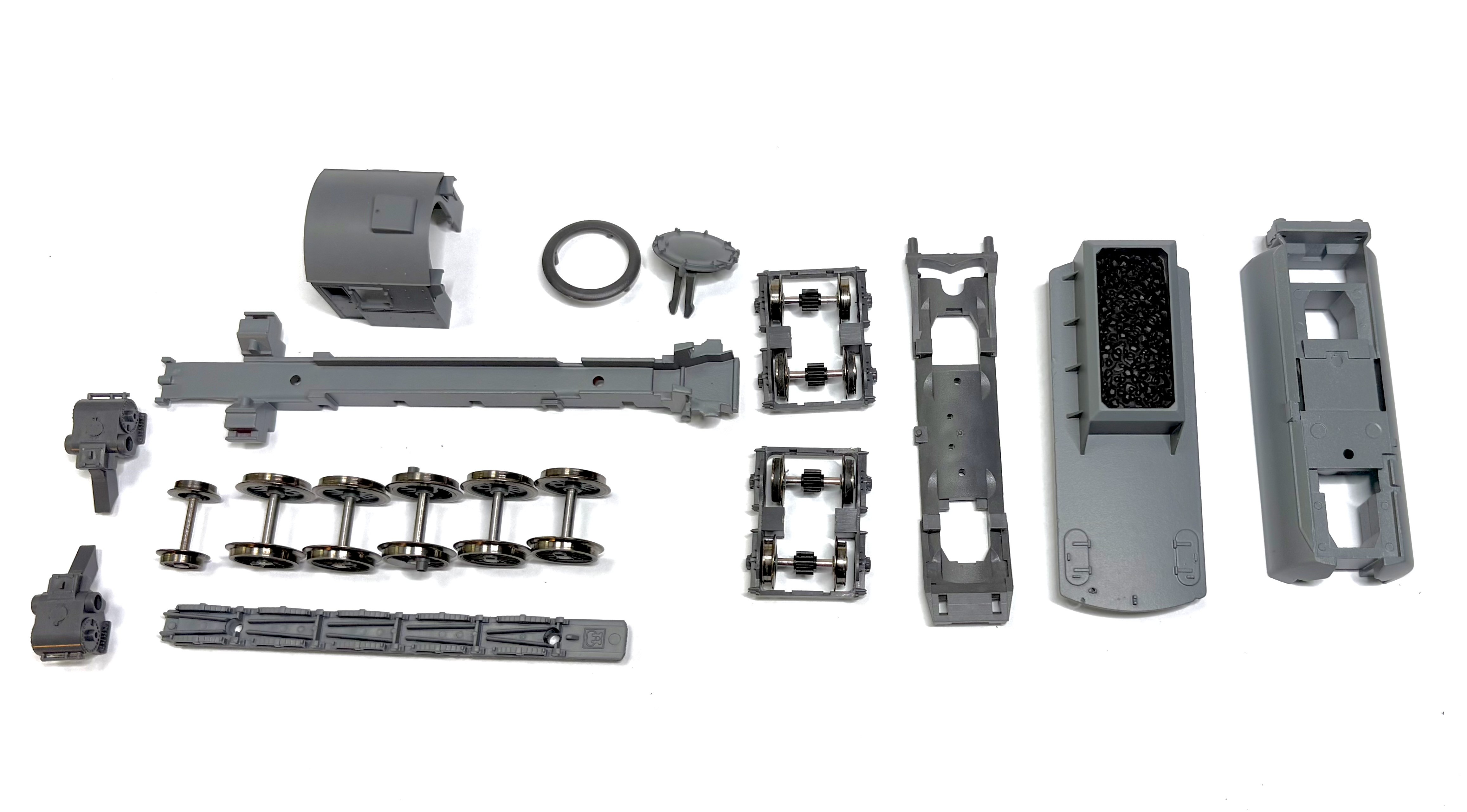 1x Führerhaus, 1x Rauchkammertür, 2x Drehgestellblende , 1x Gummiwulst (für Tender) ,1x Tenderboden, 1x Tenderwanne, 1x Tenderoberteil