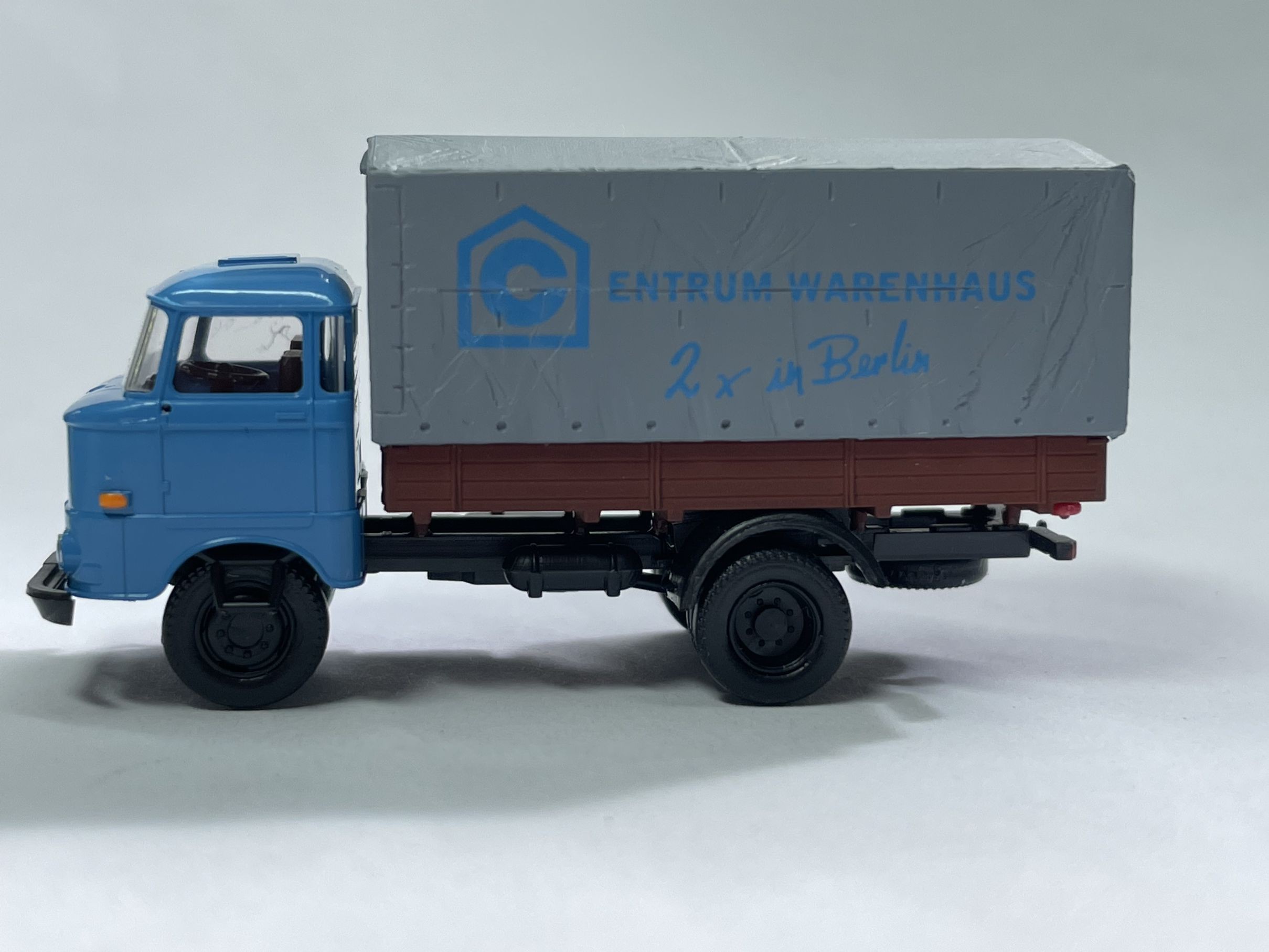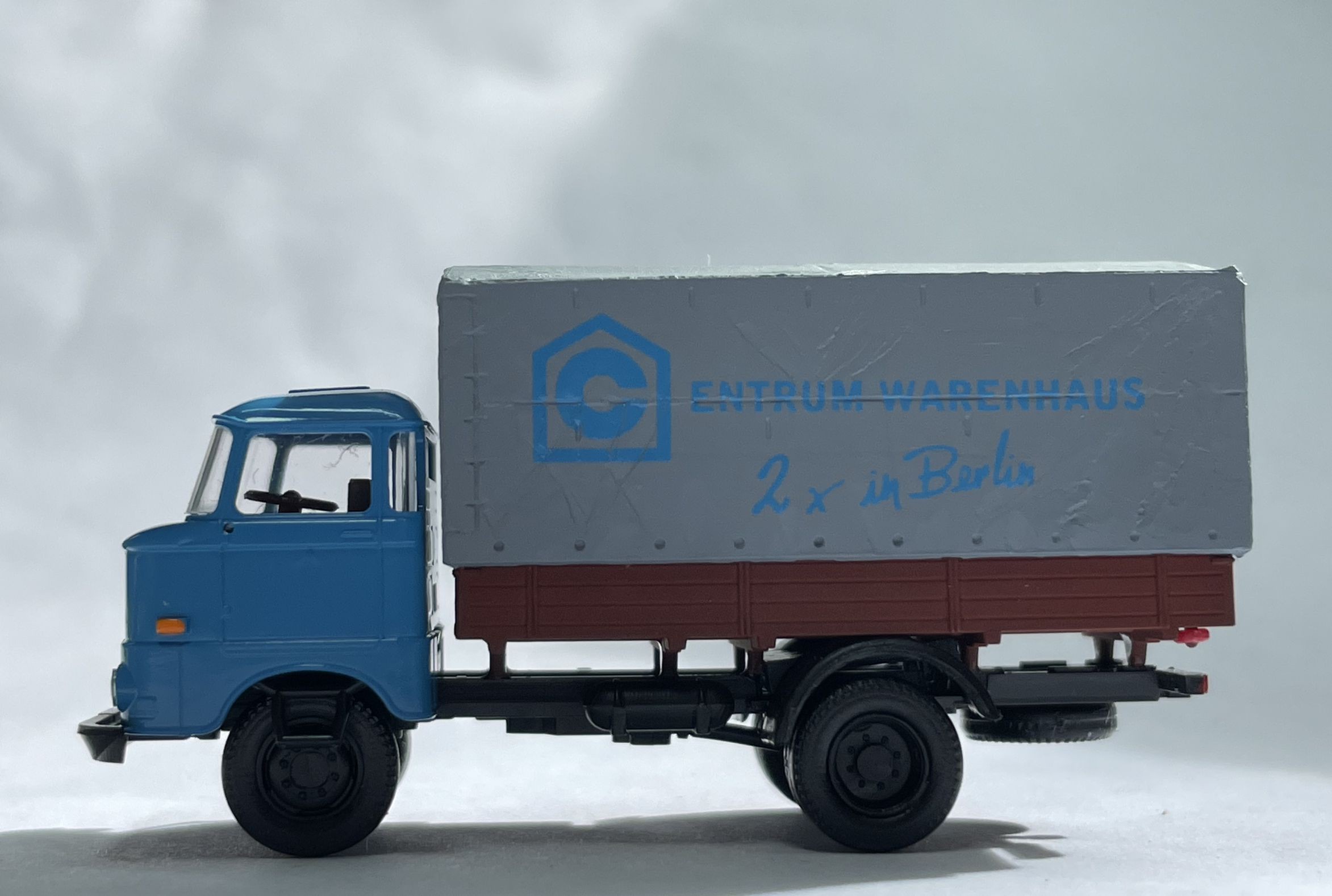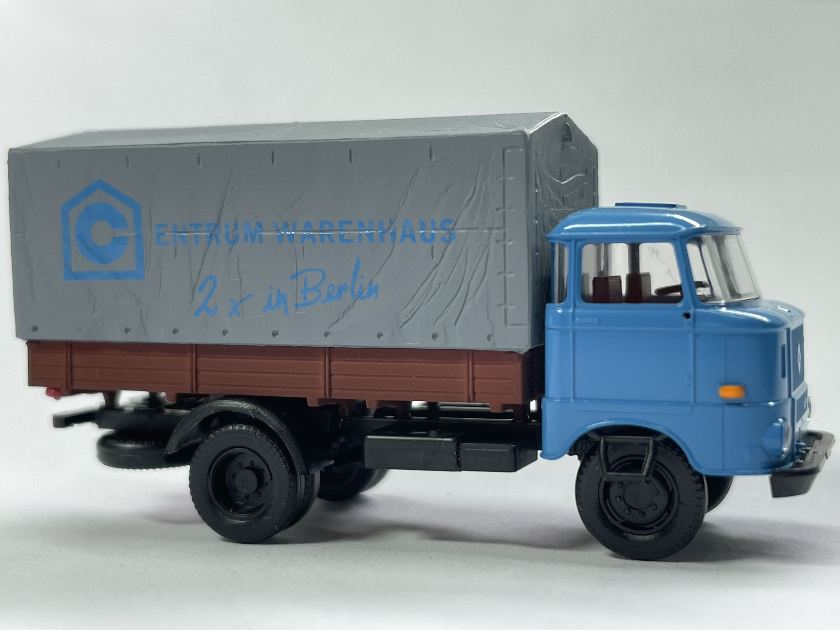 Unter dem Motto „ klein aber ganz fein“ haben wir dieses Mal die Wünsche der Sondermodell-Fangemeinde besonders beherzigt und mit dieser Osterüberraschung die Auflage auf 99 Stück ,also ausreichender Menge, erhöht, sowie ein qualitativ hochwertiges Modell zu einem mehr als attraktivem Preis aufgelegt. Das Vorbild pendelte sowohl zwischen den beiden bekannten Berliner Centrum-Warenhäusern am Alex und am Ostbahnhof, wurde aber auch bei dringenden Warenabholungen von den Herstellerbetrieben innerhalb der gesamten DDR genutzt. Die Warenhäuser waren das Aushängeschild der Hauptstadt der DDR, leere Regale konnte man sich dort nicht leisten. Um den schnellen Nachschub an Waren zu realisieren wurde u.a. dieser LKW eingesetzt. Informationen von Transporten von/nach Berlin(West) halten sich hartnäckig, sind jedoch visuell nicht belegt.