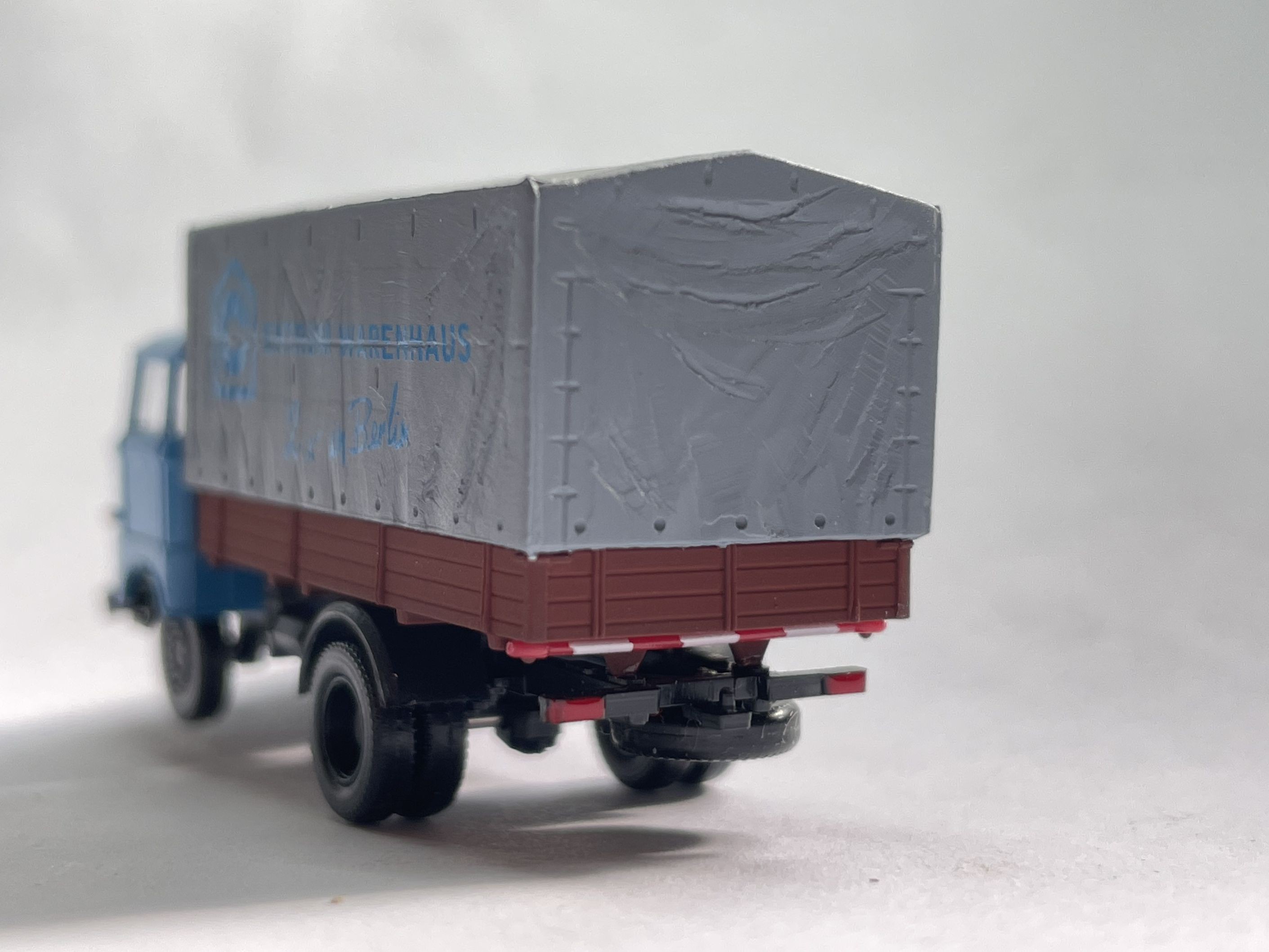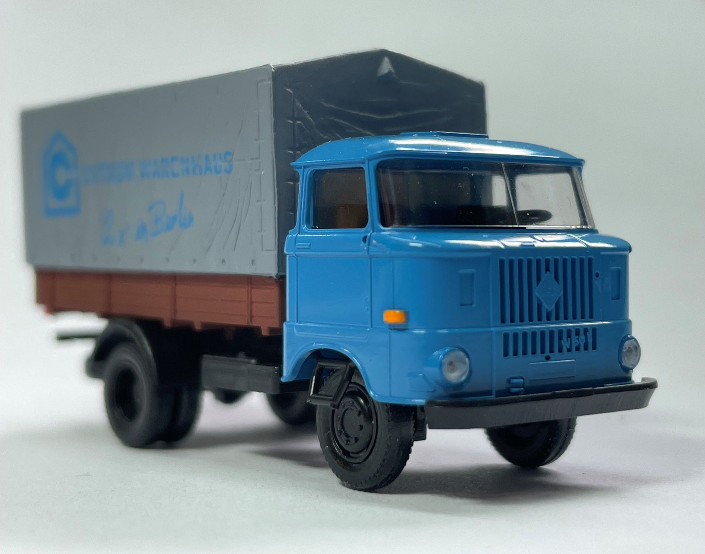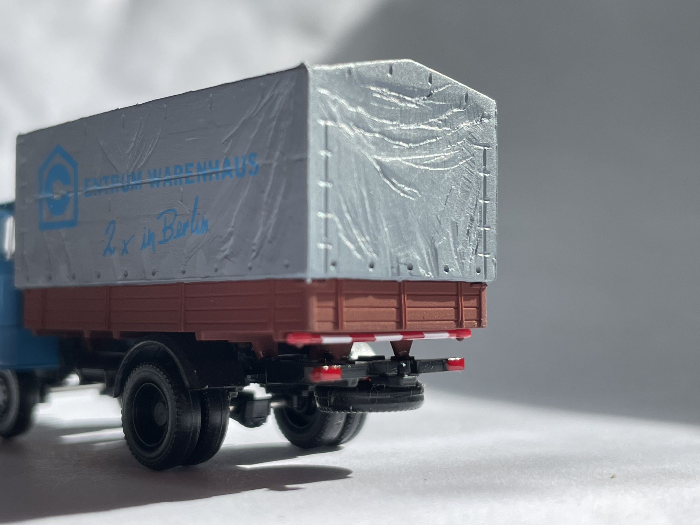 Unter dem Motto „ klein aber ganz fein“ haben wir dieses Mal die Wünsche der Sondermodell-Fangemeinde besonders beherzigt und mit dieser Osterüberraschung die Auflage auf 99 Stück ,also ausreichender Menge, erhöht, sowie ein qualitativ hochwertiges Modell zu einem mehr als attraktivem Preis aufgelegt. Das Vorbild pendelte sowohl zwischen den beiden bekannten Berliner Centrum-Warenhäusern am Alex und am Ostbahnhof, wurde aber auch bei dringenden Warenabholungen von den Herstellerbetrieben innerhalb der gesamten DDR genutzt. Die Warenhäuser waren das Aushängeschild der Hauptstadt der DDR, leere Regale konnte man sich dort nicht leisten. Um den schnellen Nachschub an Waren zu realisieren wurde u.a. dieser LKW eingesetzt. Informationen von Transporten von/nach Berlin(West) halten sich hartnäckig, sind jedoch visuell nicht belegt.